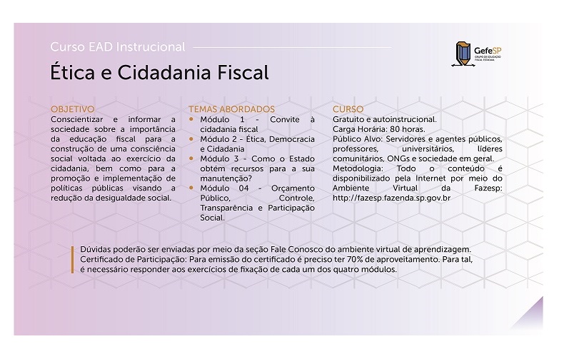 Você está em: Portal da Educação Fiscal > Notícias > Fazesp está com inscrições abertas para o curso EAD de Ética e Cidadania Fiscal (Cidadãos) – Turma 1 Notícias Notícias 16/02/2018 14:30 Retificado em: () Fazesp está com inscrições abertas para o curso EAD de Ética e Cidadania Fiscal (Cidadãos) – Turma 1 Imagem Conteúdo da PáginaCurso EAD - gratuitoÉtica e Cidadania Fiscal – Turma 1 CursoPúblico AlvoVagasÉtica e Cidadania Fiscal – Turma 1Professor da rede pública e privada de ensino, universitários, membros de organizações sociais interessados na temática, servidores públicos e cidadãos em geral800 A Escola Fazendária do Estado de São Paulo (Fazesp), por meio do Centro de Educação Fiscal (CEF) informa que de 19 de fevereiro a 19 de março (ou até esgotarem-se as vagas) receberá inscrições para a 1ª turma de 2018 do curso Ética e Cidadania Fiscal. O curso é gratuito e será realizado no próprio ambiente virtual da Fazesp de 19 de março a 25 de maio. O conteúdo é direcionado a cidadãos interessados em obter conhecimentos sobre tributação, responsabilidades do Estado e exercício da cidadania, além de contribuir para a transparência na gestão pública e na prática da responsabilidade fiscal.Entre os temas abordados estarão o Brasil e seus desafios; o papel da educação na transformação da sociedade; a estrutura dos poderes e suas atribuições; a classificação dos tributos; o panorama da sociedade brasileira atual; controle, transparência, lei de acesso à informação e participação social, o que é Ética e a diferença entre ética e moral.Com carga horária de 80 horas, o curso terá quatro módulos:• Convite à cidadania fiscal; Ética,• Democracia e Cidadania;• Como o Estado obtém recursos para a sua manutenção;• Orçamento Público, Controle, Transparência e Participação Social.Para aprovação e emissão de certificado será necessário alcançar no mínimo 70% de acerto nas questões ao final de cada módulo. Período de inscrições: de 19 de fevereiro a 19 de março (ou até esgotarem-se as vagas) Período de realização: de 19 de março a 25 de maioInscrição acesse: https://fazesp.fazenda.sp.gov.br. Tags Relacionadas: ead; Educação Fiscal; Ética